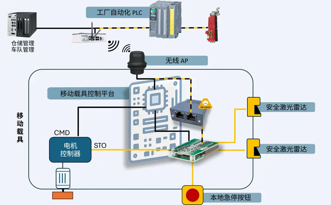 理想应用:AGV 和 AMR 在未安装本地安全传感器的情况下,或需要通过最小改动添加远程安全停止功能时适用。也适用于控制移动式附加设备,如机器人手臂或输送带。