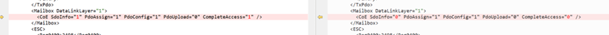 由于报文中没有发现主站对 PDO 的编辑配置报文,且主站不主动切换从站的状态机,而 ESI 文件中 PDOAssign 与 PDOconfig 关键字都已置 1,这是必须使能的功能,而 CompleteAccess 关键字是有可能影响主站配置从站 PDO 的行为的,CompleteAccess 关键字打开意味着主站会通过一次邮箱通信将 PDO 配置信息全部写入从站,此次从站的每个 PDO 中都包含多个 PDO Entry,CompleteAccess PDO 配置需要较长字节的邮箱通信。但是一般情况下主站可以通过分段下载解决邮箱长度不足的问题,在之前 NX701 和从站通信的报文中也没有看到邮箱通信 Segment download 的关键字,因此 CompleteAccess 关键字使能有可能影响了通信。