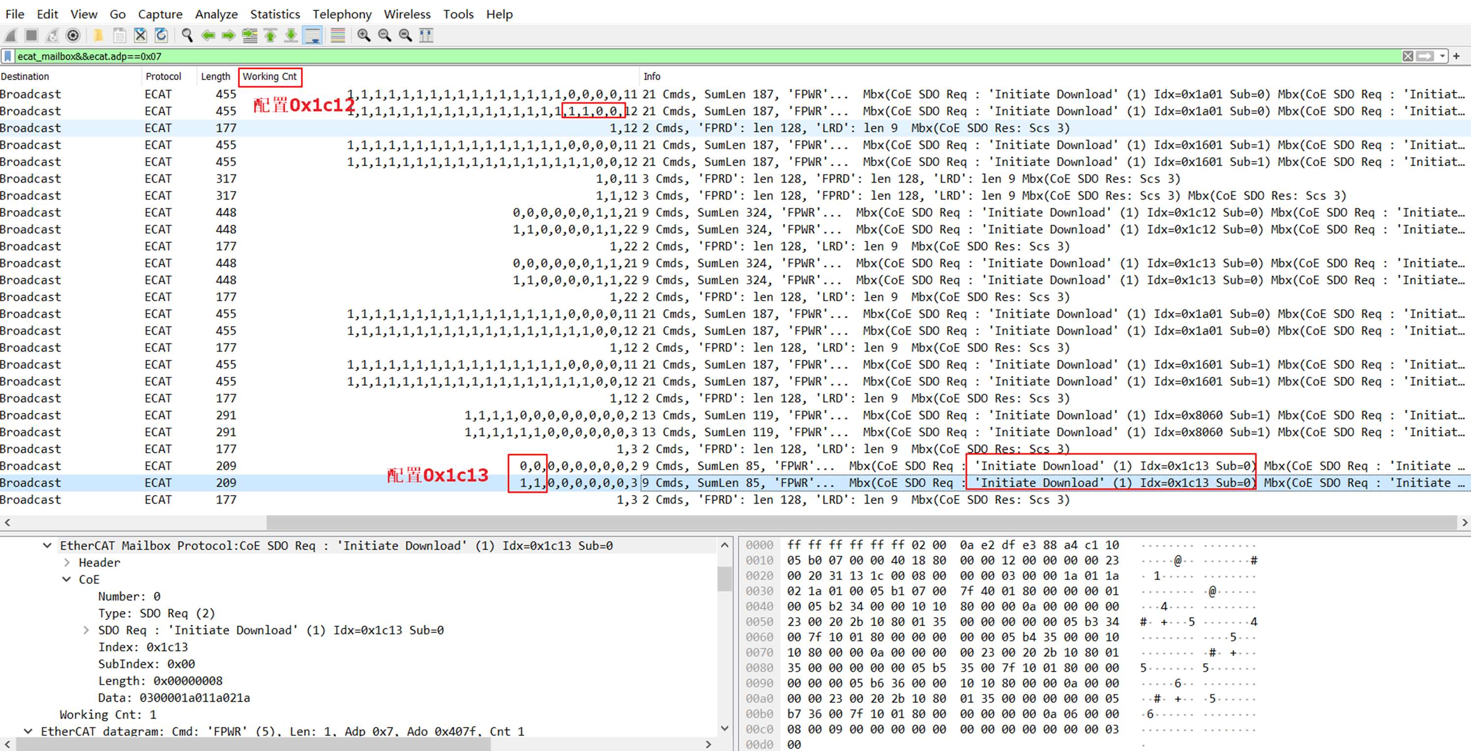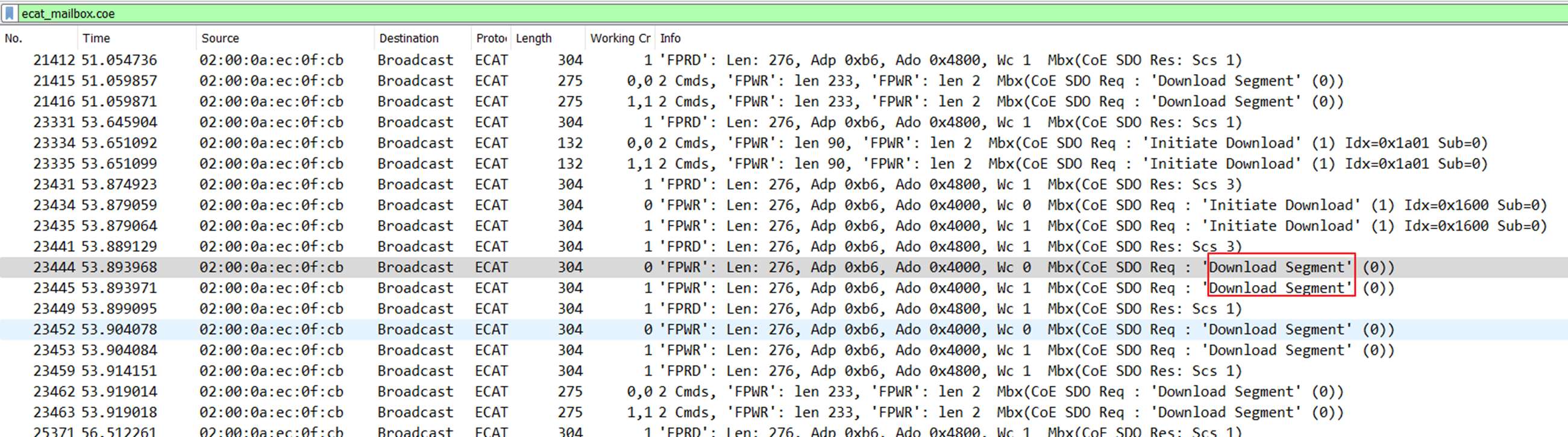 为了排除这一可能,通过修改 Anybus CompactCom 40 EtherCAT 模块的 ESI 文件,将 Anybus CompactCom 40 EtherCAT ESI 文件中的 CompleteAccess 置 0,关闭该功能,NX701 PLC 与 Anybus CompactCom 40 EtherCAT 在 EtherCAT 通信恢复正常,问题终于得到解决。报文中可看到,在关闭 CompleteAccess 功能后,NX701 PLC 通过单个对象写入的方式对 Anybus CompactCom 40 EtherCAT 0x1600、0x1601,0x1a00、0x1a01 等 PDO 对象进行了正常的初始化写入操作,见下方部分报文截图(图 7)。