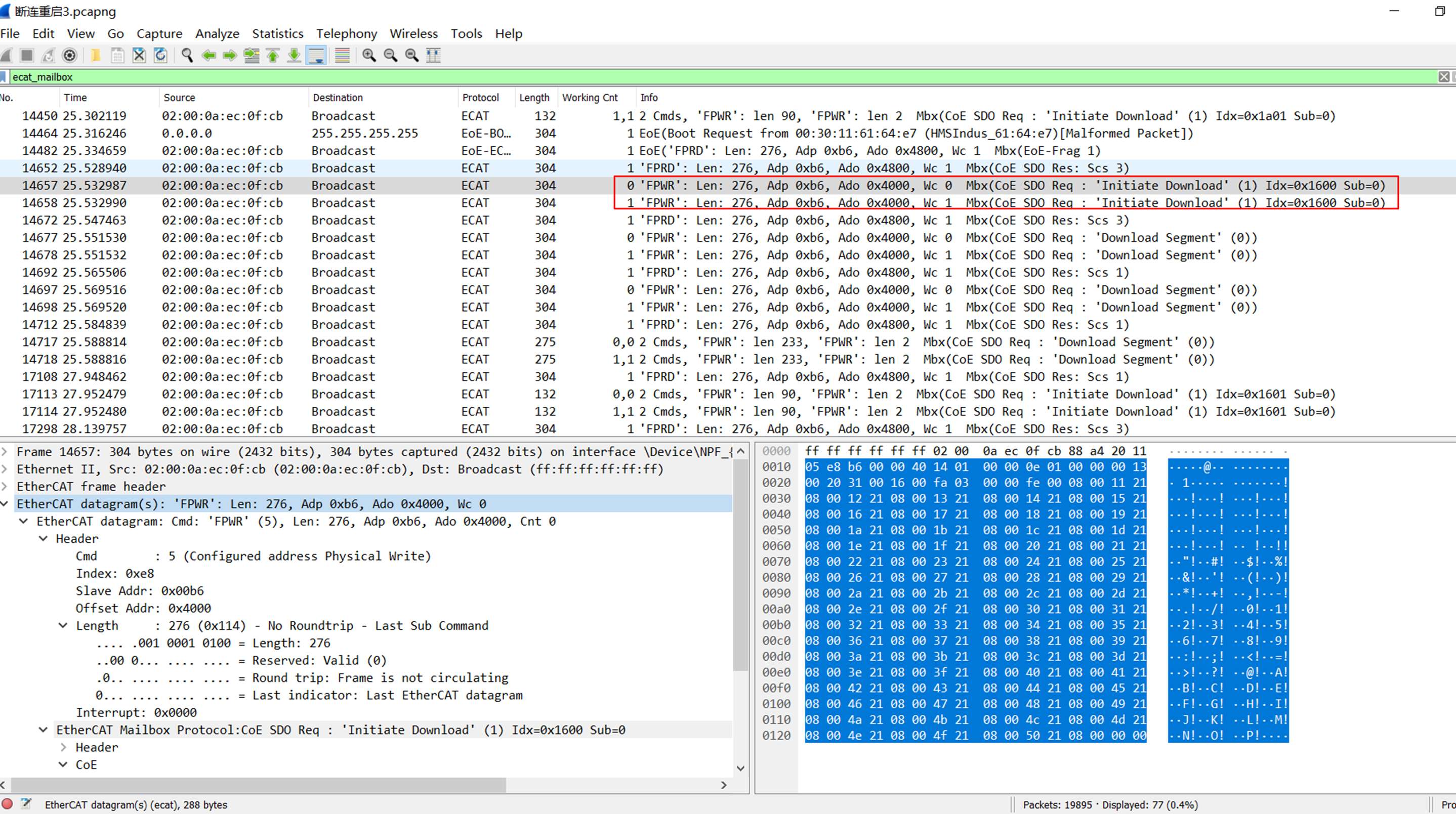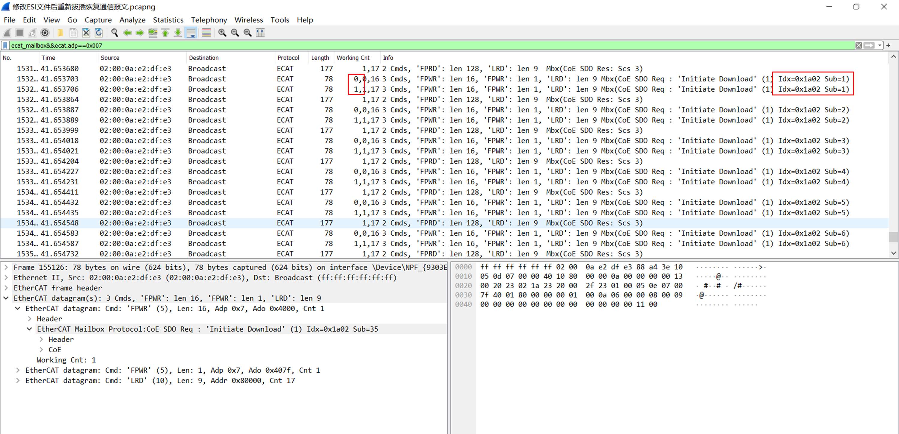 欧姆龙 NJ501 PLC 与模块的通信也是正常的,这不禁让人费解,问题会出在哪里。从 PLC 诊断信息上我们已经获取不到任何帮助了,只能通过分析欧姆龙 PLC 与 Anybus CompactCom 40 EtherCAT 模块之间的通信报文,获取一些线索了。