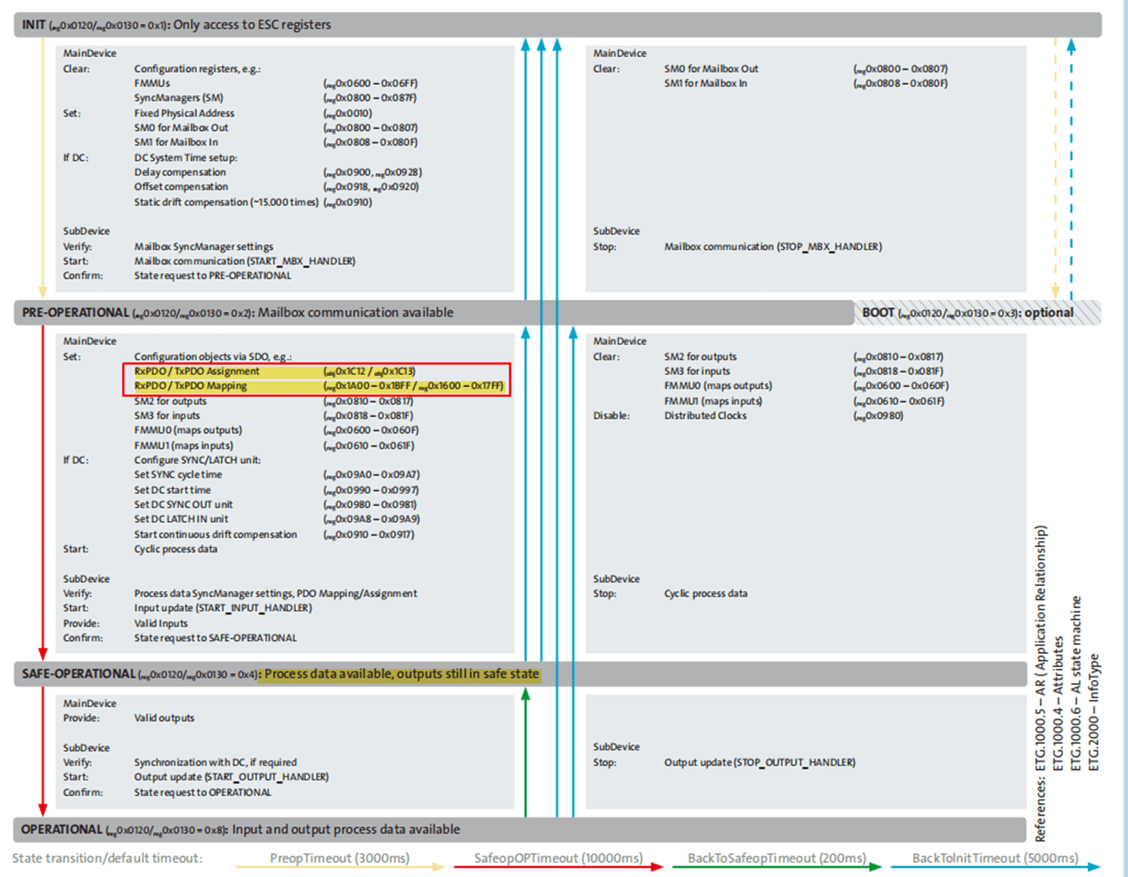 通过 PLC 提示的模块是由 PRE-OP 切换到 SAFE-OP 切换失败,基于从站状态机切换所需的工作流程,我们将问题初步定位在 PDO 配置上,大部分的 EtherCAT 主站在与从站建立通信的过程中都会依据从站的 ESI(XML)文件提供的信息在初始化时向从站写入 PDO 配置。